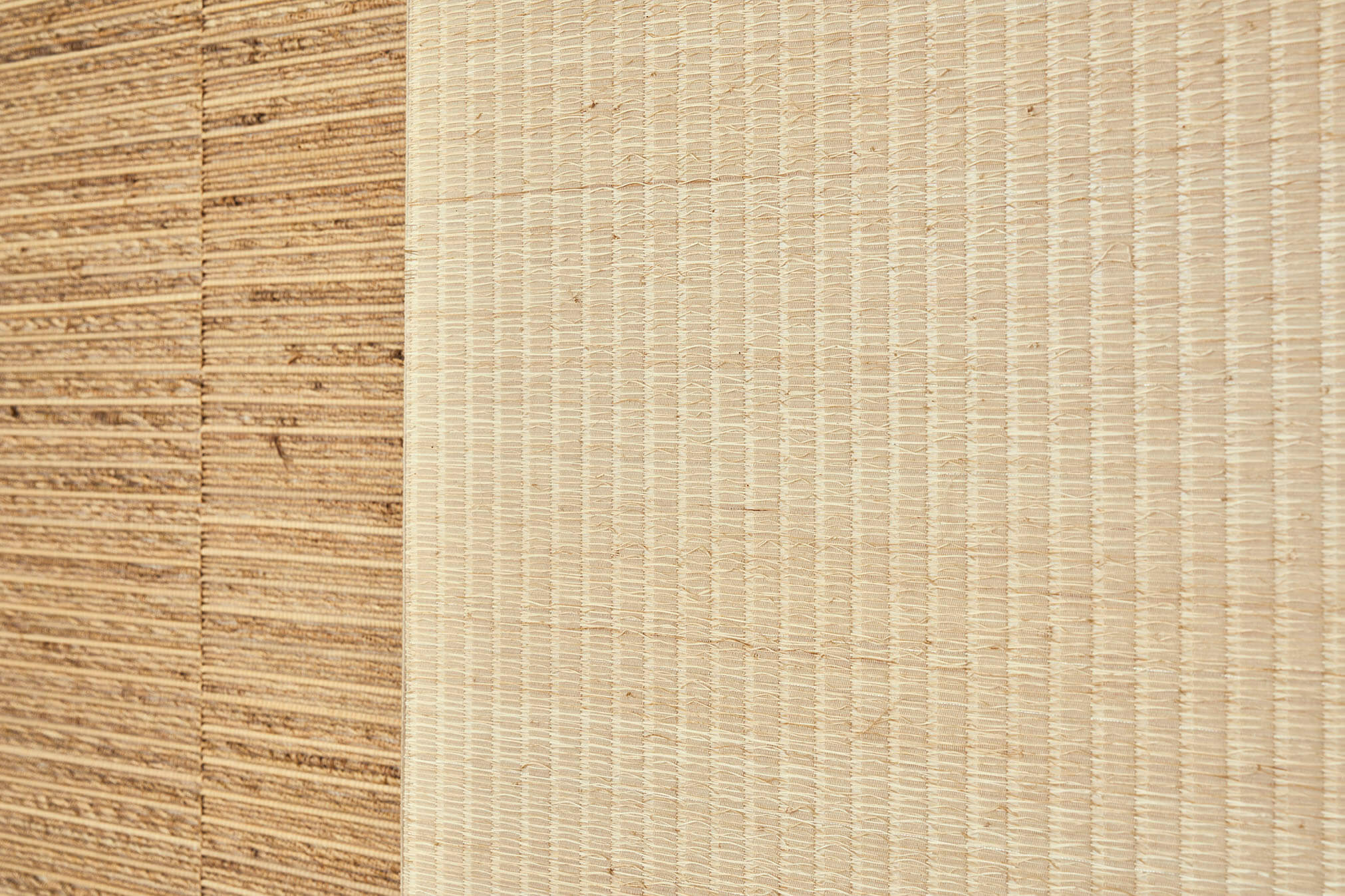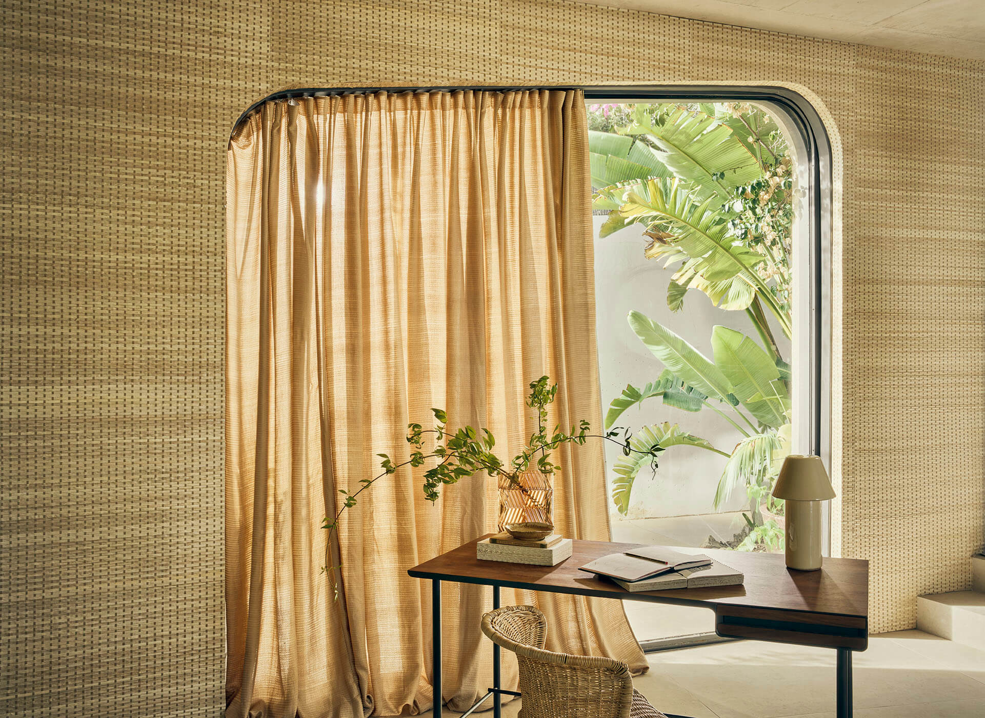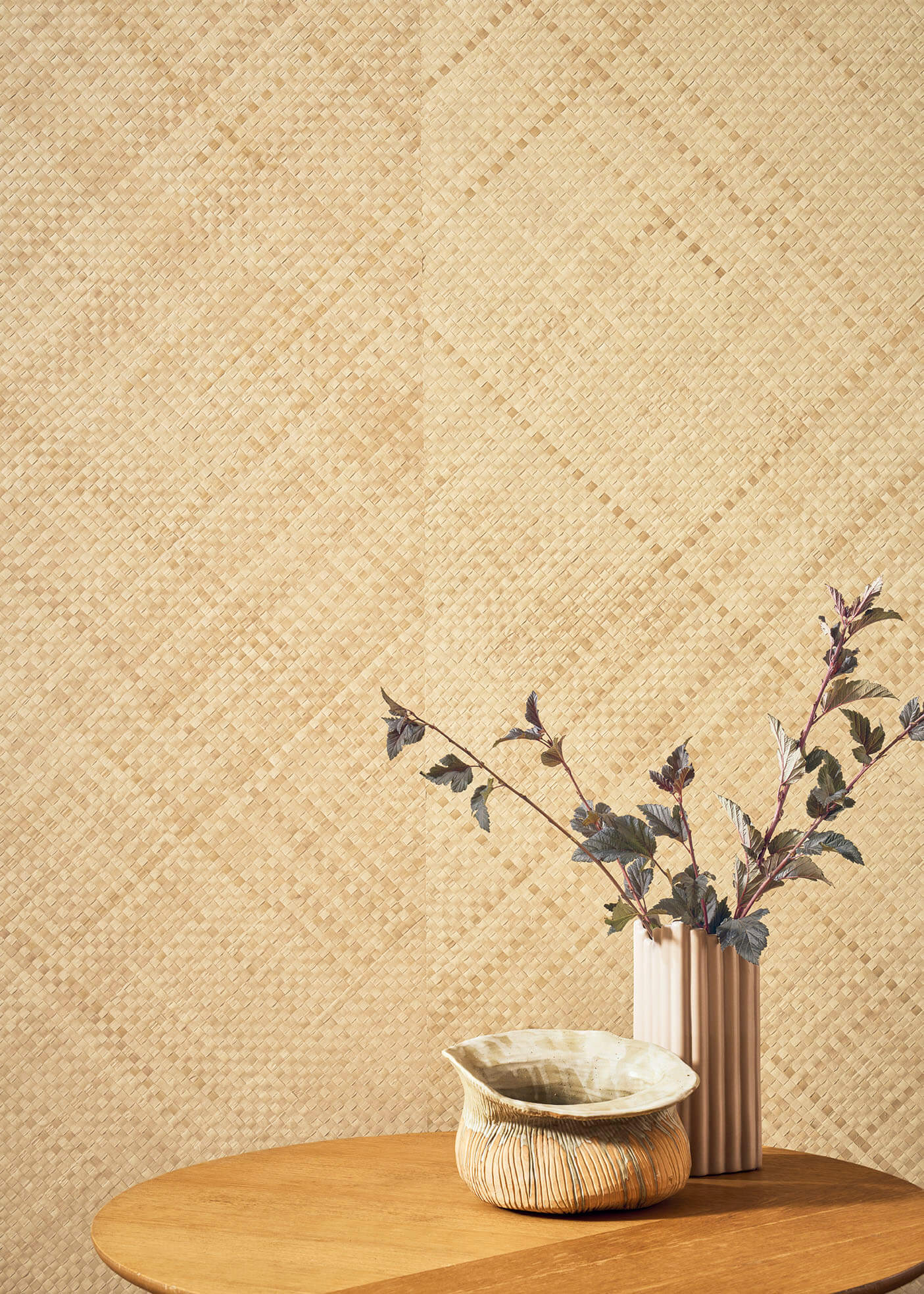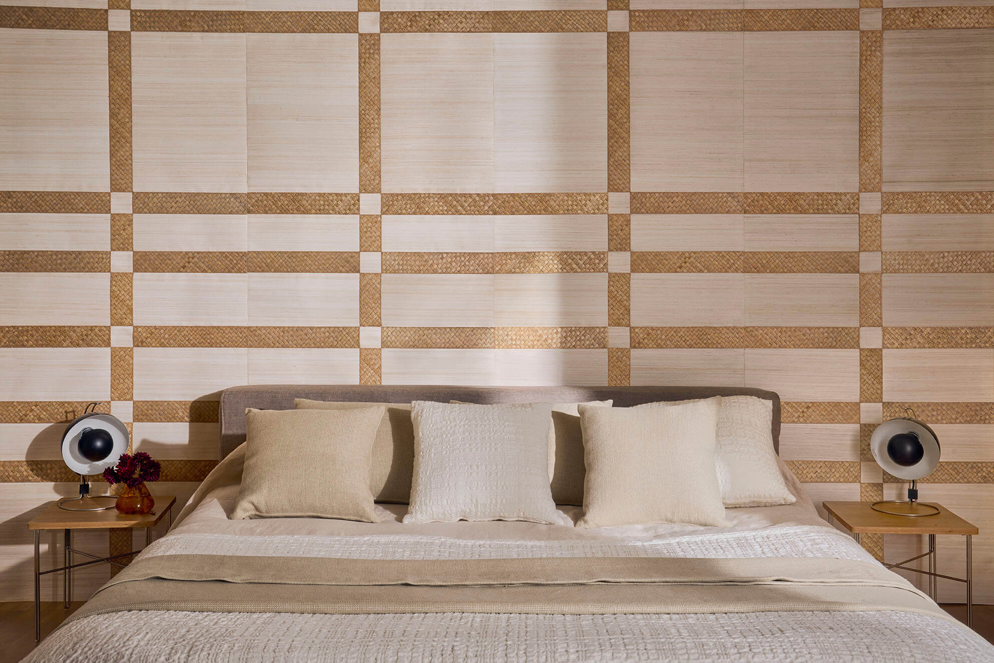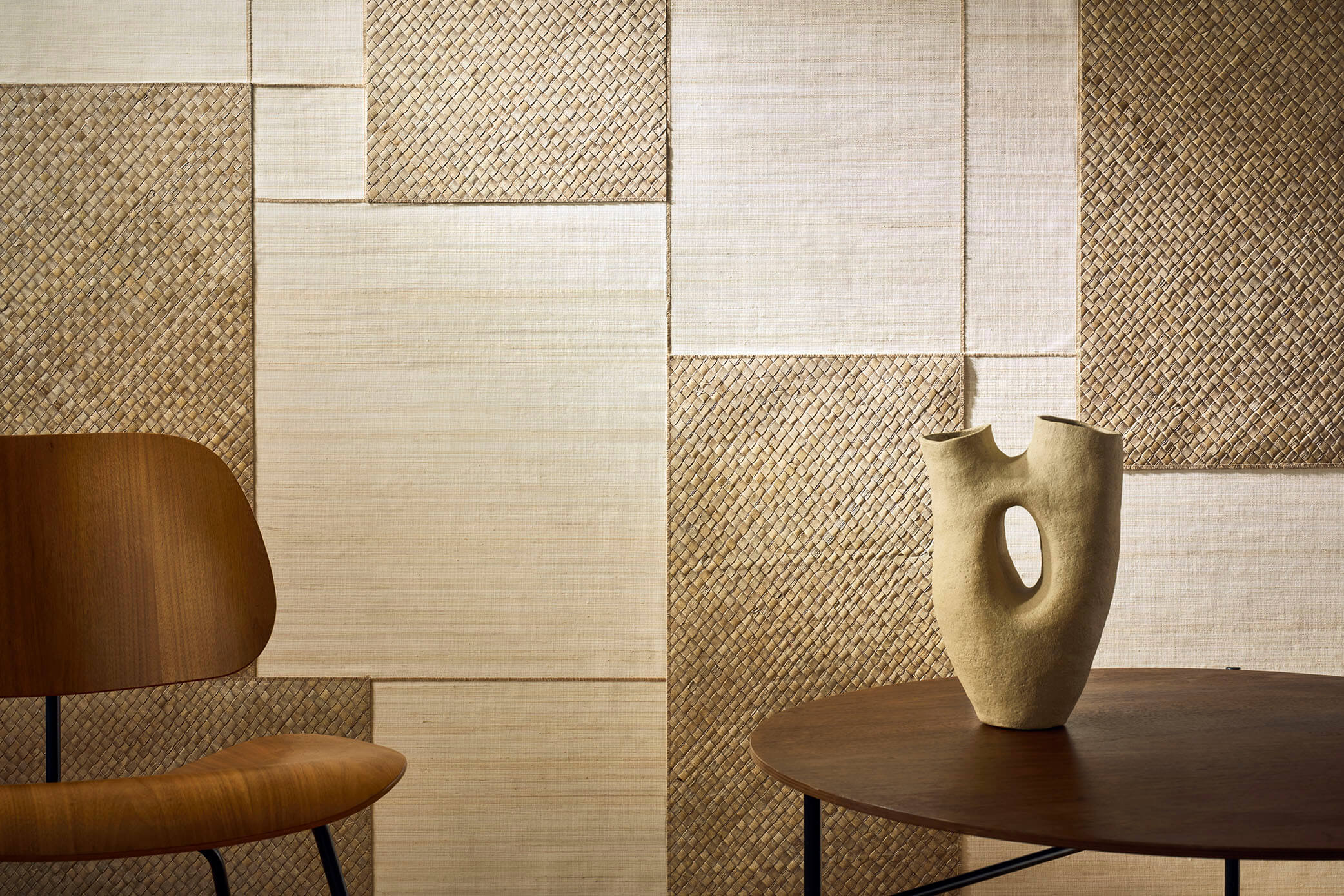 Un hommage absolu au tressage, où s’exprime la voie claire et tactile d’un artisanat à l’inspiration japonisante. Nattes, tressages en damier ou marqueterie bimatière font renaître palmier, bambou et abaca sous un jour singulier, évoquant subtilement shojis et kakemonos. Au fil de teintes naturelles, mais aussi d’un bleu et d’un noir somptueux, se révèle la beauté brute des fibres ainsi magnifiées.